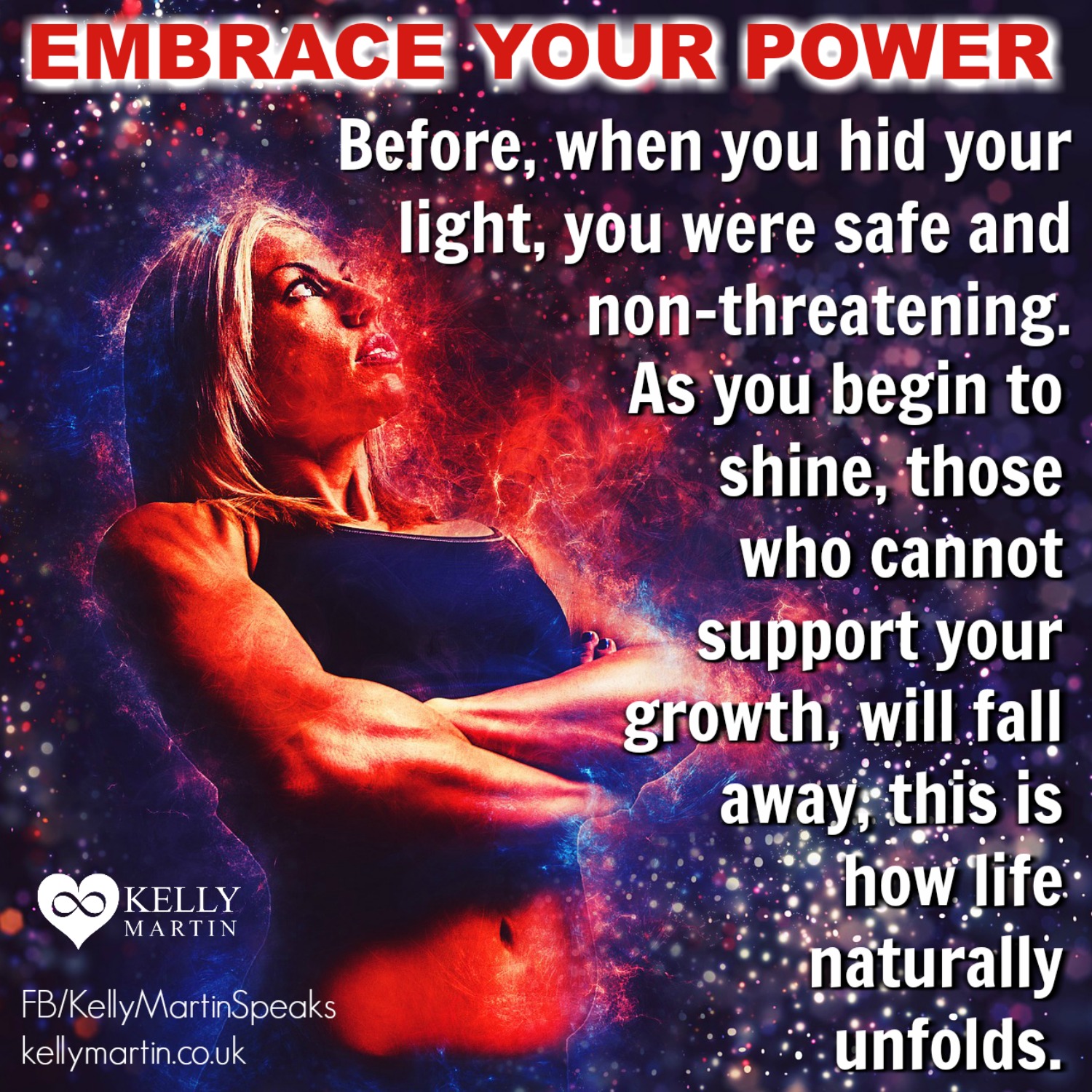 “EMBRACE YOUR POWER – Before, when you hid your light, you were safe and non-threatening. As you begin to shine, those who cannot support your growth will fall away, this is how life naturally unfolds.” ~ Kelly Martin